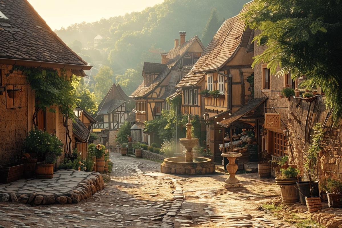 Le village apparaît enfin au détour d’une colline : quelques maisons de pierre, un clocher, une palissade fatiguée, un pont levis. Rien d’inhabituel.
